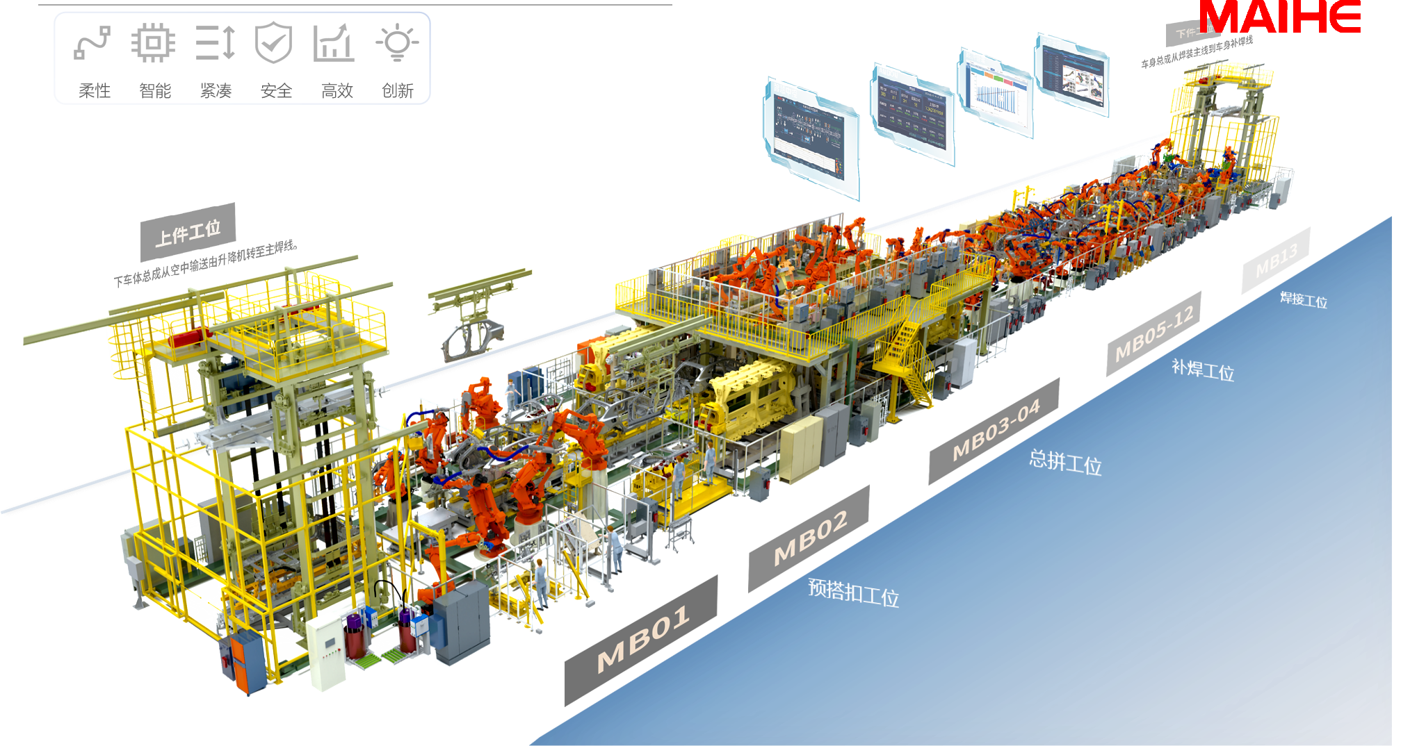 本项目规划占地约800亩,总投资32亿元,总建筑面积11.4万平方米,打造数字化车间,新建 QMS质量管理系统、PMC生产管理系统、能源管理系统、振动监测系统等信息化系统,实现车间设备与上层应用系统的互联互通,能耗较一期降低36%,辅料消耗较一期降低19%,自动化率提升15%,成为高质、高效、高安全保障、数字化、智能化产线,实现整车柔性化、自动化、智能化、数字化生产。